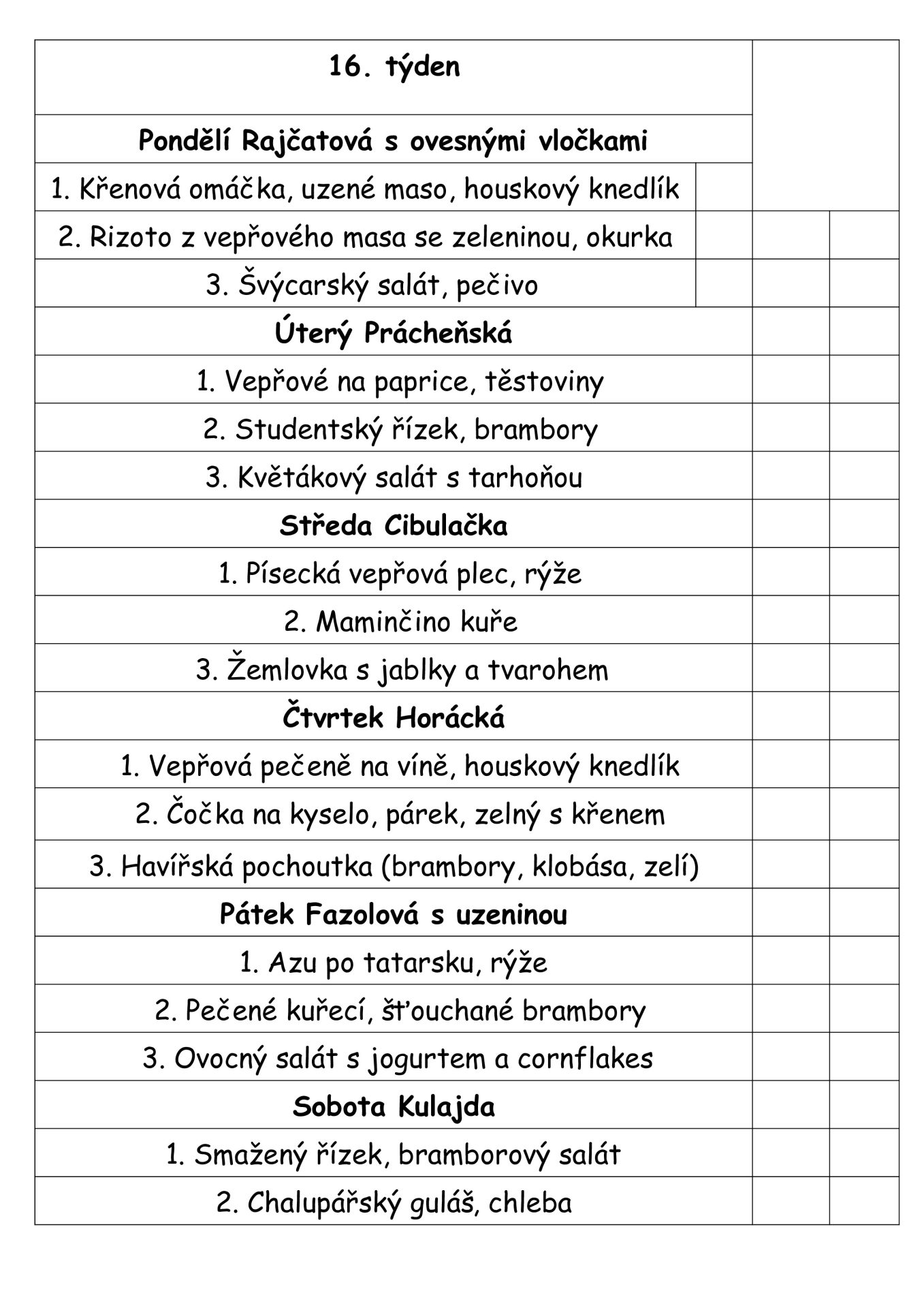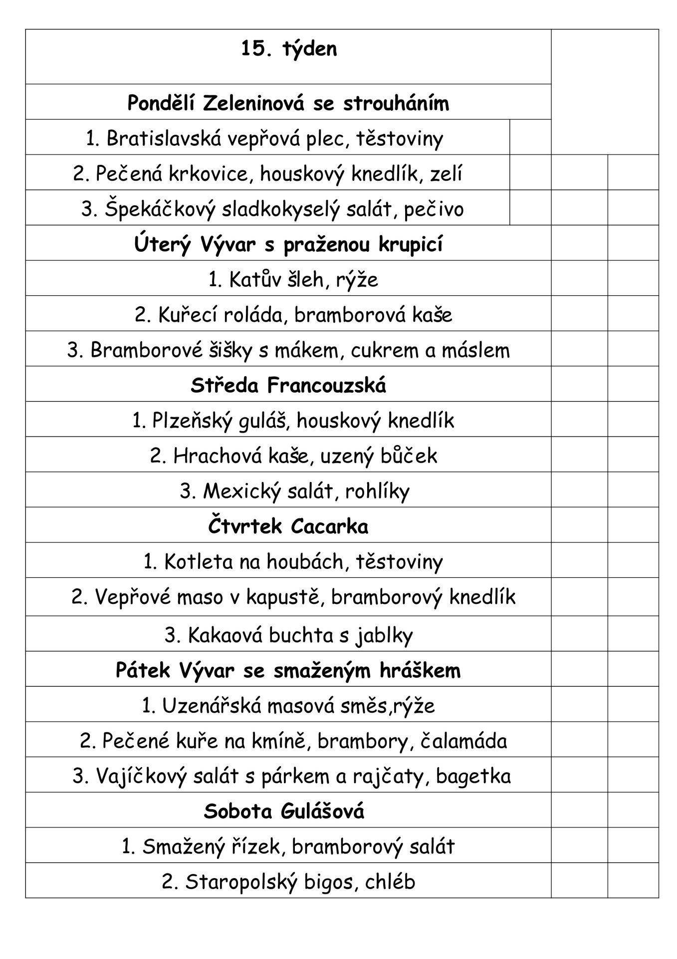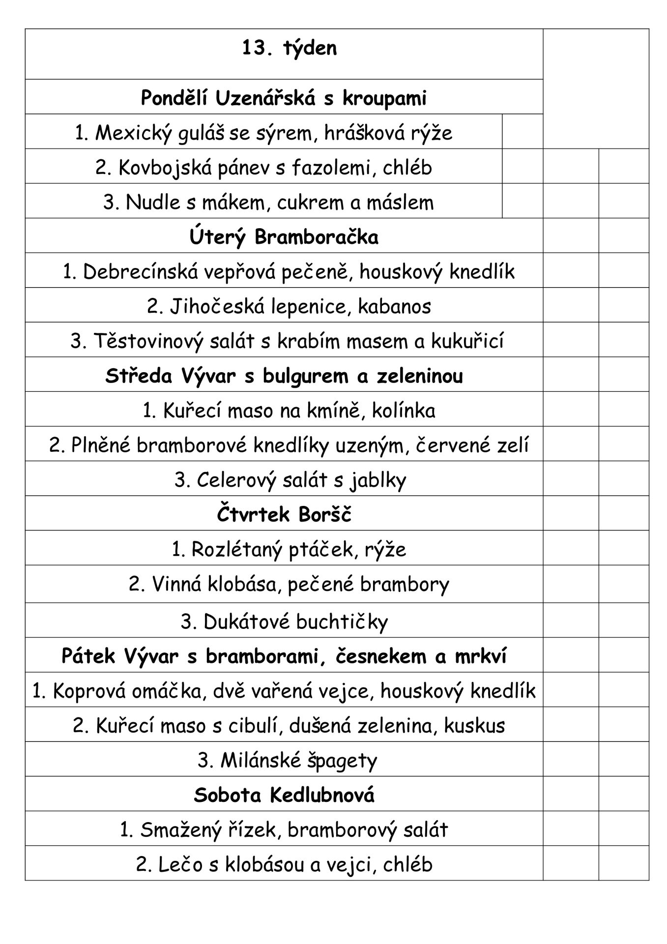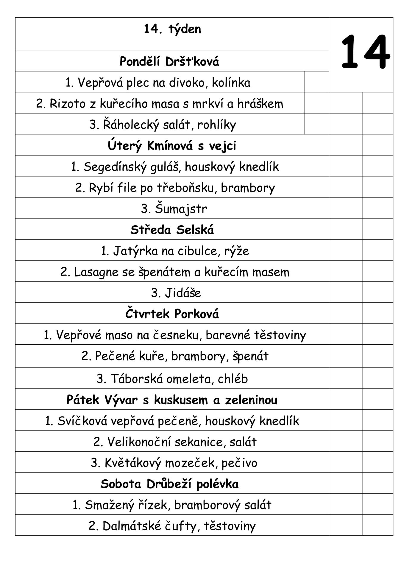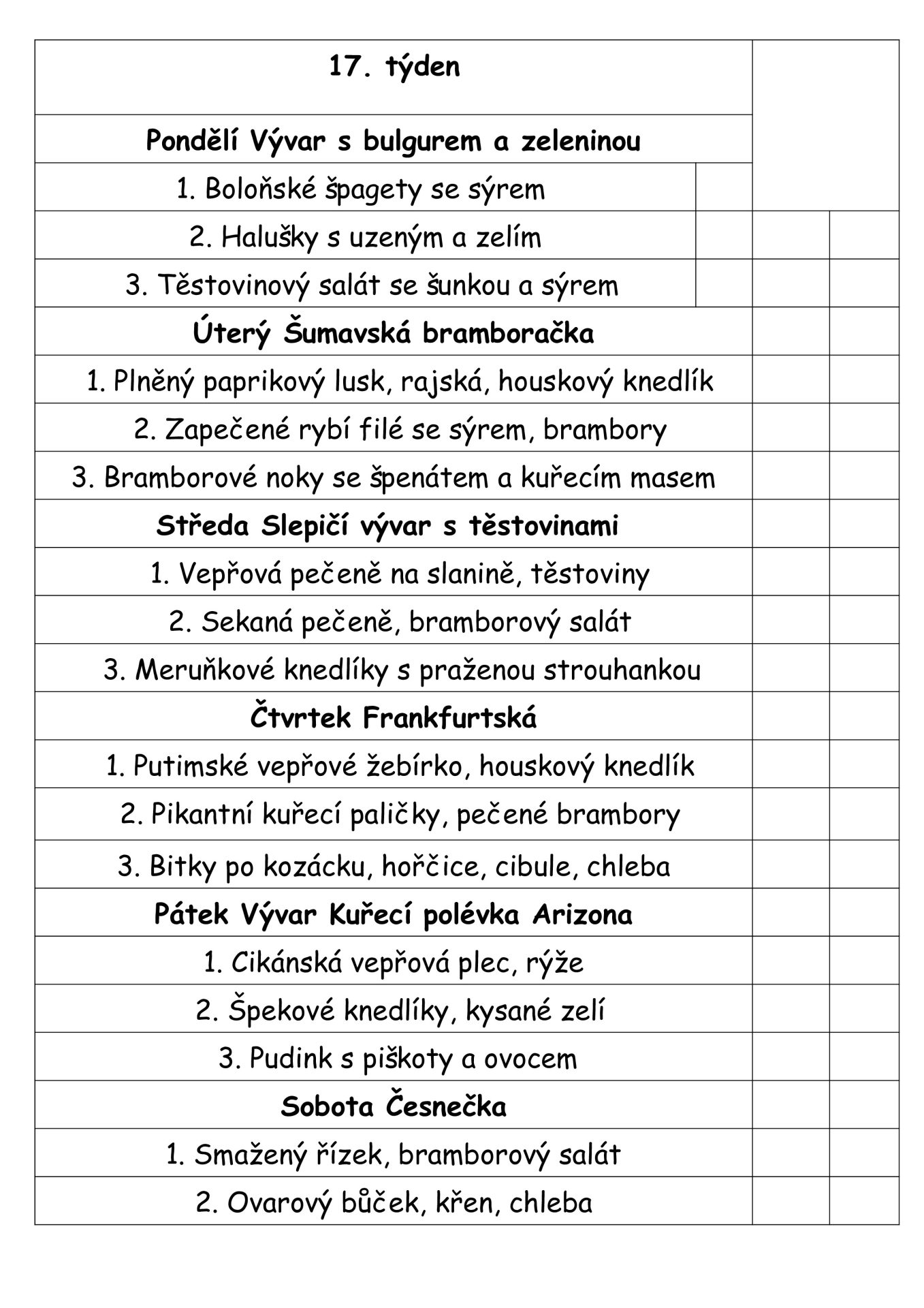 Jídelní lístky se rozdávají pravidelně ve středu, ve čtvrtek se vyplněné vracejí. Jídlonosiče poskytujeme v rámci služby bezplatně. Jsou plastové snadno se ošetřují. Cena obědového menu je 110,- a je konečná bez dalších nákladů. Aktuální nabídku vizte níže. Úplné informace dotazy a objednávky na telefonu 737 370 760 Jan Samec